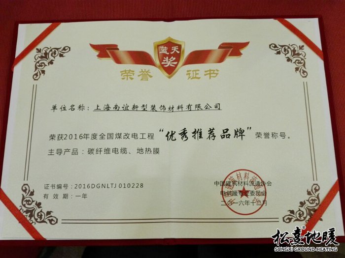 上海南誼新型裝飾材料有限公司于2016年12月18日走進(jìn)北京人民大會(huì)堂,中國(guó)電供暖行業(yè)"藍(lán)天獎(jiǎng)”頒獎(jiǎng)典禮在這隆重舉行。本公司榮獲“全國(guó)煤改電工程優(yōu)秀推薦品牌”榮譽(yù),這次藍(lán)天獎(jiǎng)由專家嚴(yán)格評(píng)審?fù)ㄟ^(guò),我們表示:將一如既往為中國(guó)電供暖發(fā)展提供更完美的產(chǎn)品,更環(huán)保的產(chǎn)品,更安全的產(chǎn)品。讓市民擁有藍(lán)天,消除霧霾,擁有健康而努力。